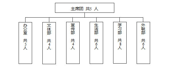 办公室、宣传部、学习部、生活部、文体部、外联部。