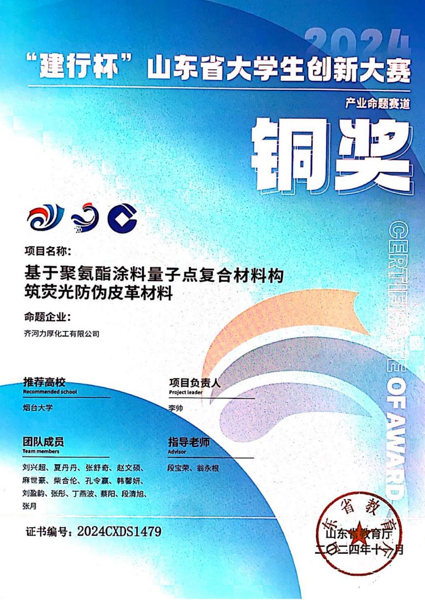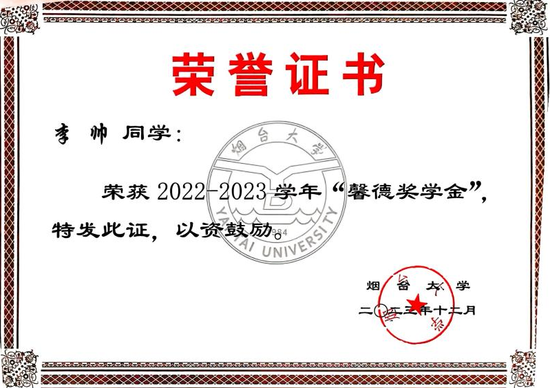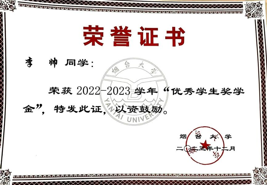 李帅,共青团员,化学化工学院高222-1班学生。在学习方面,她连续三年裸分和综测成绩均位于专业前列,曾获“馨德奖学金”“汉高奖学金”、烟台大学“优秀学生奖学金”;在学生工作方面,她现任班级心理委员;在科研竞赛方面,她积极参与各项科创竞赛,曾取得多个国家级奖项以及省级奖项、发表会议论文2篇。