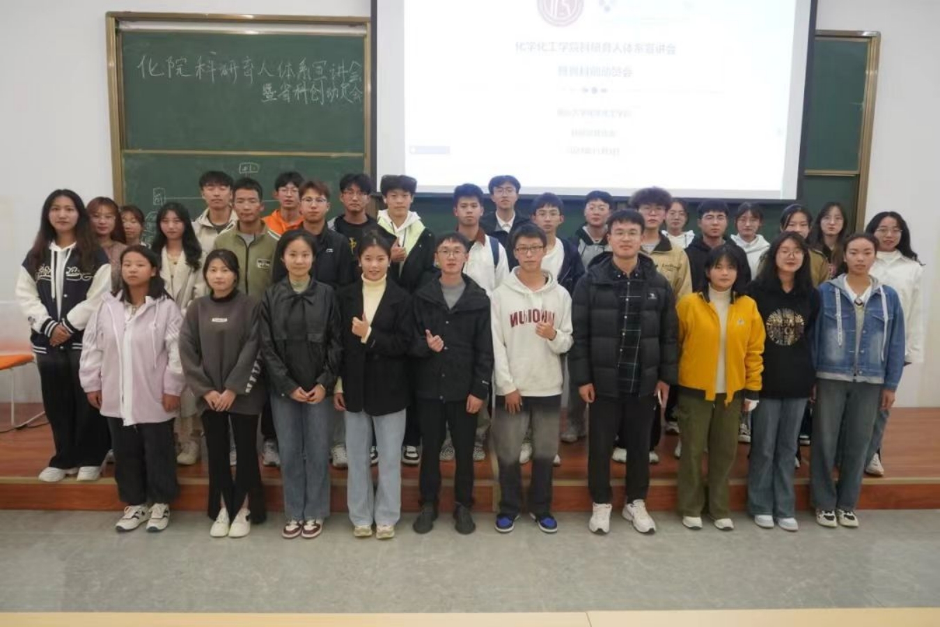 化学化工学院“科研育人”体系宣讲会幕后工作人员与老师合影留念。
