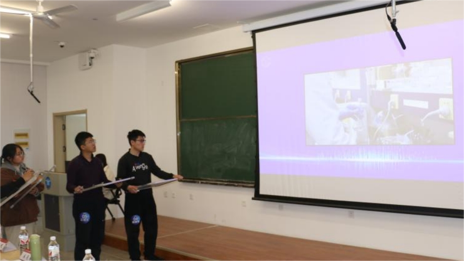 精彩的演唱结束后,参赛选手们进行实验设计陈述,选手们一一讲解自己的实验设计方案。四位选手讲解完后评委老师进行点评打分。6号核装备与核工程学院王博文、11号化学化工学院夏丹丹成功突围,进军决赛。