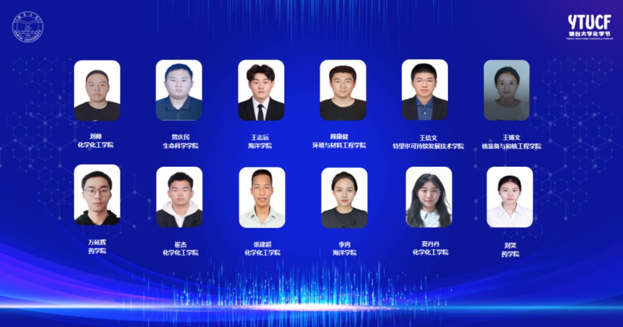 入围决赛共12名选手,他们分别是(从左到右,从上往下):化学化工学院刘帅、生命科学学院曾庆民、海洋学院王志远、环境与材料工程学院顾康健、特里尔可持续发展学院王信文、核装备与核工程学院王博文、药学院万延辉、化学化工学院张健超、化学化工学院崔杰、海洋学院李冉、化学化工学院夏丹丹、药学院刘笑。
