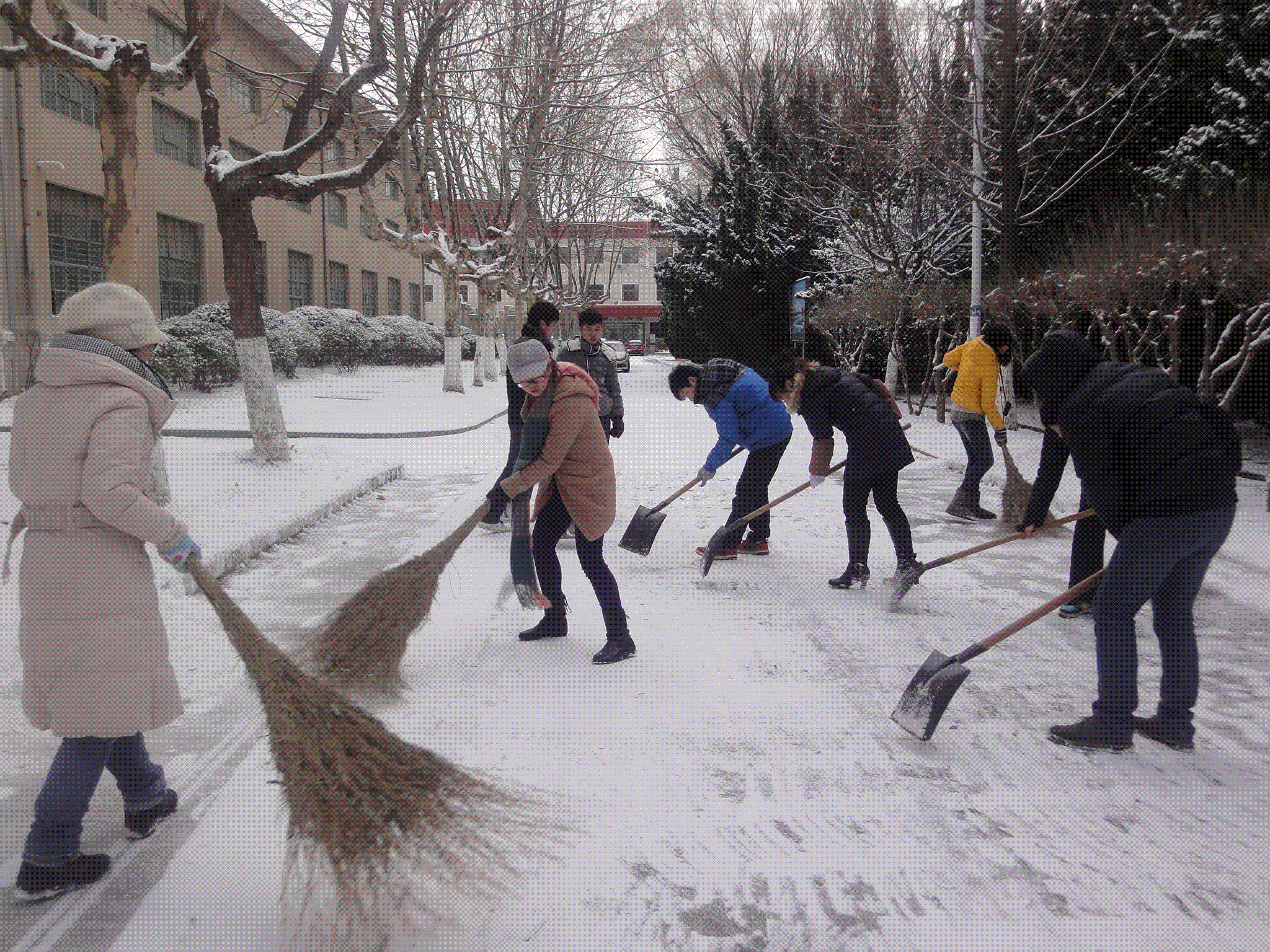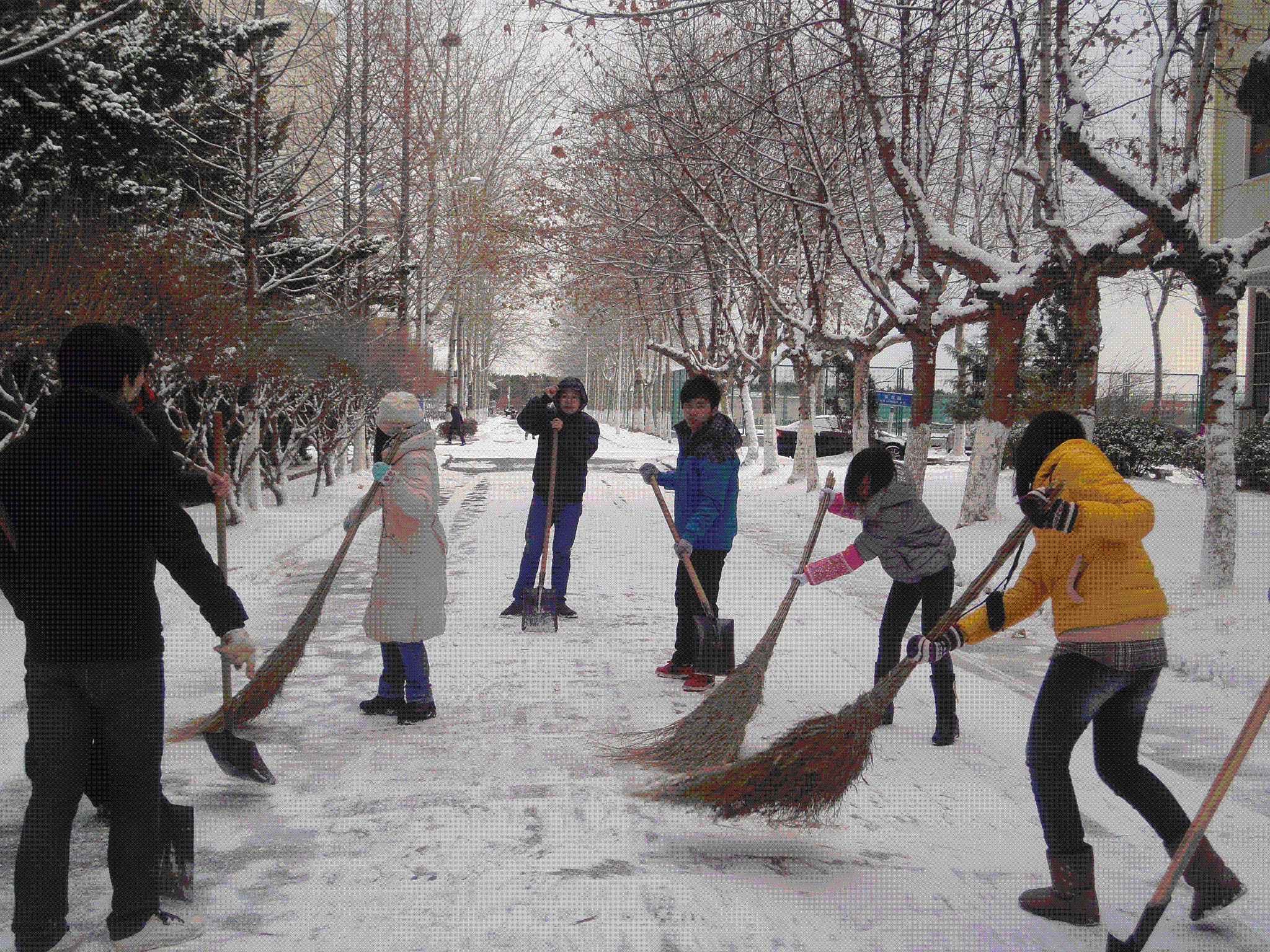 早上积雪上冻,清除起来有些困难,同学们分工合作,有的拿着铁锹敲打路上的冰雪,有的拿着扫帚及时清扫被铲碎的冰雪。虽然天寒地冻,不少同学脸和手都冻红了,但是大家干活干得热火朝天,充满了乐趣。