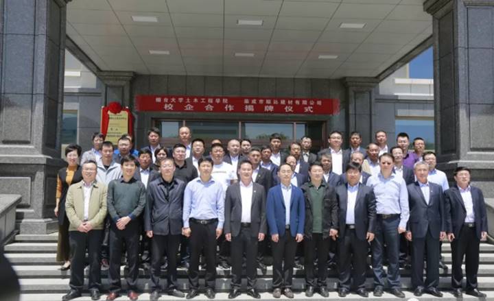 5月16日上午,烟台大学土木工程学院与荣成市顺达建材有限公司在荣成顺达新材料产业园共同举办校企合作创新实践基地揭牌仪式,此次合作成立了高性能混凝土工程技术中心及固废产业化应用工程技术中心。荣成市建设局孙乃毅、张华茂主任,石岛建设局王龙威局长、周磊副局长及东山街道王曙光书记等领导, 烟台大学土木工程学院逯静洲副院长、张岩副院长、周新刚教授, 赤山集团相关部门主要负责人及赤山建设各企业主要负责人共计50多人参加了揭牌仪式。