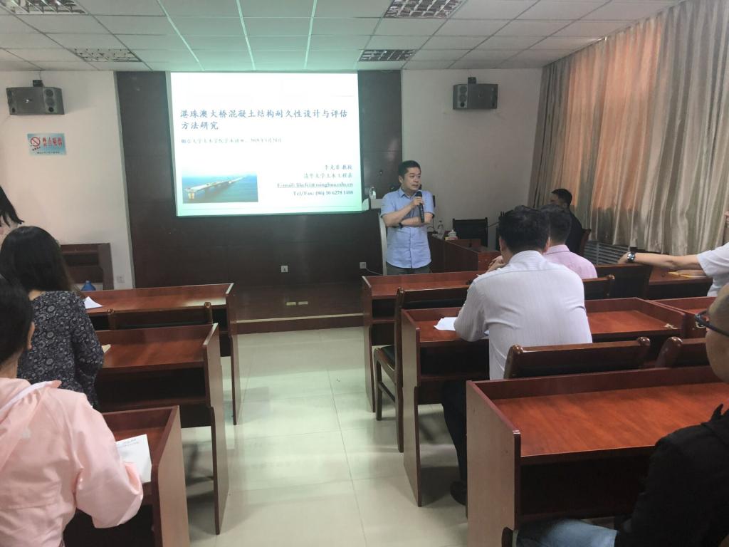 讲座开始,李教授首先向大家介绍了这项举世瞩目的浩大工程,从港珠澳大桥的工程简介引入本次讲座主题,详细讲解了港珠澳大桥混凝土结构耐久性设计、混凝土施工质量控制、混凝土结构耐久性评估以及研究总结等相关内容。李教授提到,港珠澳大桥的耐久性设计首先建立了总体设计策略,将耐久性过程区分为控制过程和非控制过程,并分别在材料和结构层次上明确了针对各个耐久性过程的设计要求。李教授还强调,大桥工程施工阶段的混凝土质量控制参数为混凝土抗压强度、混凝土氯离子扩散系数和钢筋保护层厚度,并建立了各个参数的验收准则;混凝土表面无损检测为辅助质量控制参数;通过施工过程中各个参数的数据收集和分析获得了参数的真实统计规律。并且根据施工过程中各个控制参数的统计规律,该项工程建立了用于施工期混凝土构件耐久性能水平评价的估计模型,提高了混凝土构件的可靠指标。