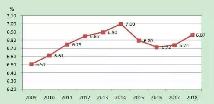 2009-2018年建筑业增加值占国内生产总值比重(来源:国家统计局)
