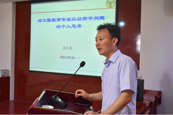2021年9月16日下午,高等教育土木工程专业评估(认证)委员会副主任委员、东南大学童小东教授莅临烟台大学土木工程学院,对我院土木工程专业评估(认证)工作进行指导,在土木馆A302会议室为学院全体教师作题为《对工程教育专业认证若干问题的个人思考》的专题报告。报告由土木工程学院院长逯静洲主持,土木工程学院党总支书记李军、土木工程学院副院长樊海涛以及数十名专业教师参加了本次报告会。