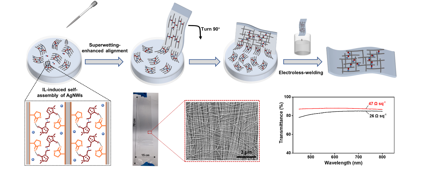 基于此,烟台大学化学化工学院刘洪亮教授团队通过超浸润诱导转移法将离子液体(1-乙基-3-甲基咪唑(双三氟甲烷磺酰)亚胺)和银纳米线组成的自组装复合物转移到可拉伸基底上,成功制备了大面积、可拉伸、有序的银纳米线电极。在此基础上,使用化学焊接进一步降低银纳米线之间的接触电阻。制备的可拉伸透明电极具有 26-46 Ω sq-1 的低薄层电阻,在 550 纳米波长下具有 84%-88% 的高透光率。基于这种可拉伸透明电极的透明加热设备具有优异的电加热性能和拉伸稳定性。这项研究为制备新一代可拉伸设备所需的高性能大面积、可拉伸透明电极提供了一种新方法。