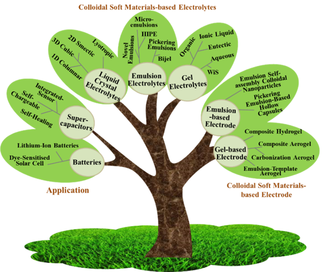 基于上述的研究进展,思考如何通过材料创新赋能器件柔性化、高性能化与多功能集成。胶体软物质(如液晶、乳液、凝胶等)因其独特的自聚集能力、可调控的微/纳米通道和流变性能,为这一难题提供了突破性思路。近期,作者系统梳理了基于胶体软物质的柔性器件设计策略与应用进展,成果发表于《Advances in Colloid and Interface Science》(IF=19.3)。主要涵盖3方面:电解质材料设计:液晶电解质、乳液电解质、凝胶电解质;电极材料设计:以乳液、水凝胶和气凝胶为基础,构建多孔电极结构,增加活性位点;性能提升机制:通过调控胶体软材料的纳米结构、界面化学和机械性能,实现储能器件能量密度、功率密度和柔韧性的协同优化。未来可进一步探索新型多功能胶体软物质以及多功能集成等方向,为下一代储能传感技术开辟路径(Adv. Colloid Interface Sci. 2025, 345, 103629)。