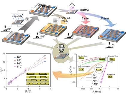 近日,我院赵玉潮教授团队利用等离子体辅助接枝改性,将甲基丙烯酰乙基磺基甜菜碱(SBMA)及1H,1H,2H,2H-全氟癸基三乙氧基硅烷接枝于聚甲基丙烯酸甲酯(PMMA)材料表面,制作了表面接触角不同的微通道,深入研究了其对气-液两相流动与气泡形成过程的影响规律,为微通道反应器的个性化设计提供了基本科学数据。