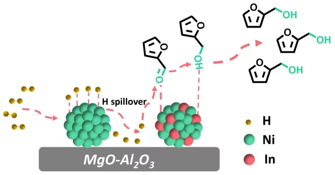 Scheme 1.A proposed dual-active sites mechanism for FAL hydrogenation to FOL over NiIn0.2/MgO-Al2O3.