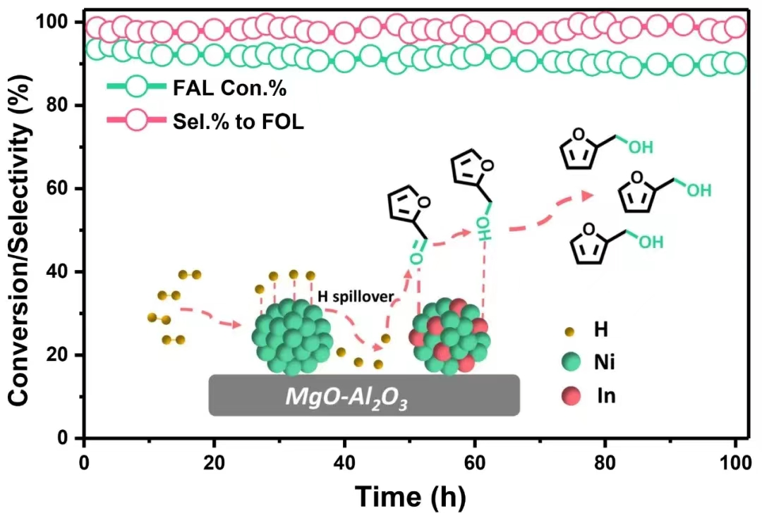 基于以上分析,我们得到了FAL在NiIn0.2/MgO-Al2O3的反应机理。FAL中的C=O键垂直吸附在Ni2In表面。同时,H2分子吸附在金属Ni上并分裂成H物种。H物种在Al2O3载体上从Ni迁移到邻近的Ni2In,并攻击活化的C=O生成C-OH物种,随后Ni-O断裂,形成FOL。这种高效的双活性位点加氢-解吸过程提高了活性位点的利用率,从而获得了高的催化活性和高的FOL选择性。