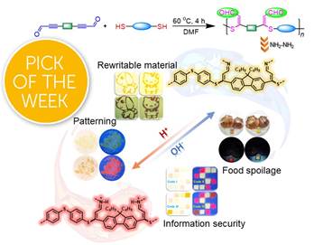 近日,烟台大学环境友好高分子团队与华南理工大学秦安军教授团队合作,建立了一种无催化醛基活化内炔与巯基的点击聚合,成功制备一系列多功能聚硫醚。利用该聚硫醚结构中的高反应性醛基及荧光芴基,不仅可实现肼的高灵敏、选择性检测;而且反应新生成亚胺键上的氮原子在不同酸碱环境中会发生可逆的质子化/去质子化反应,由此产生的分子内电荷转移过程使得聚合物光物理性质发生系列变化,实现其在多色图案化、复写材料、四重信息加密及食品保鲜监测等多场景的应用。