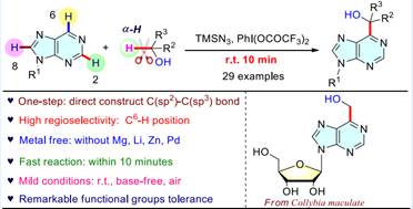 近日,我院孙凯副教授和鲁东大学于明武副教授两个团队合作,利用PIDA/TMSN3氢原子转移体系,共同开发了一种高度区域选择性的羟烷基化反应,在室温下使用醇作为羟烷基化试剂,在10分钟内合成 C6-羟基烷基化嘌呤和嘌呤核苷,反应无需金属、光照或者惰性气体保护。该研究成果发表于美国化学会的有机快报(Org. Lett., 2022, DOI:10.1021/acs.orglett.2c01680)。