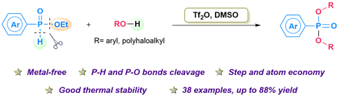 有机磷化合物(OPCs)是维持生命体正常存在和活动必不可少的物质,其在人类农业生产、医药、新材料等多个领域也均起到重要的作用。因此,探索开发简捷、高效的新方法合成该类化合物一直是化学家们研究的热点和挑战之一。但是,由于磷元素的富电子性使得磷试剂具有很强的亲核性,在已有的合成方法中,磷试剂主要作为亲核试剂被引入到有机骨架中,而其作为亲电试剂参与的化学反应受到较少的关注和研究。
