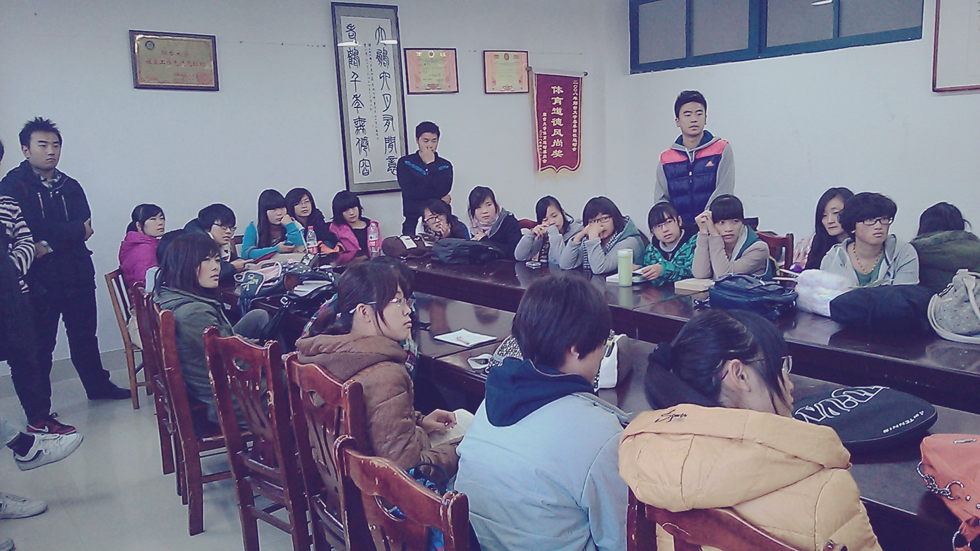 首先,班长刘相如指出,任何人不可以以任何借口带饭进入教室,影响教室卫生,并且倡导大家文明修身,做文明的高素质的当代大学生,另外他还重申了上次学工组老师做出的关于禁止使用电脑打游戏的规定。“最近林老师对翘课行为的监察力度明显加大,希望大家不要撞到枪口上,这件事关于班级集体荣誉,请大家克己自律”,刘相如接着说道。
