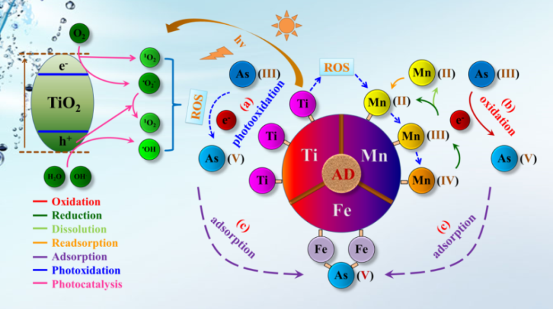此外,针对界面调控高级氧化体系无机As(III)和As(V)的去除机制进行了研究。离子强度依赖性实验和Zeta电位表征分析发现无机As(V)和As(III)的去除过程均为特异性吸附(化学吸附);材料表面官能团FTIR表征、活性氧物种ESR鉴定、材料表面元素XPS价态分析结果表明,As(III)去除机制为光催化氧化、氧化还原与吸附相耦合的作用方式,其中材料中的Ti和Mn组分主要起到了As(III)氧化作用,材料中的Fe组分主要起吸附作用;而As(V)的去除机制主要是As(V)与材料表面的羟基发生配体交换作用,在固/液界面形成稳定的内配位表面络合物(图4)。