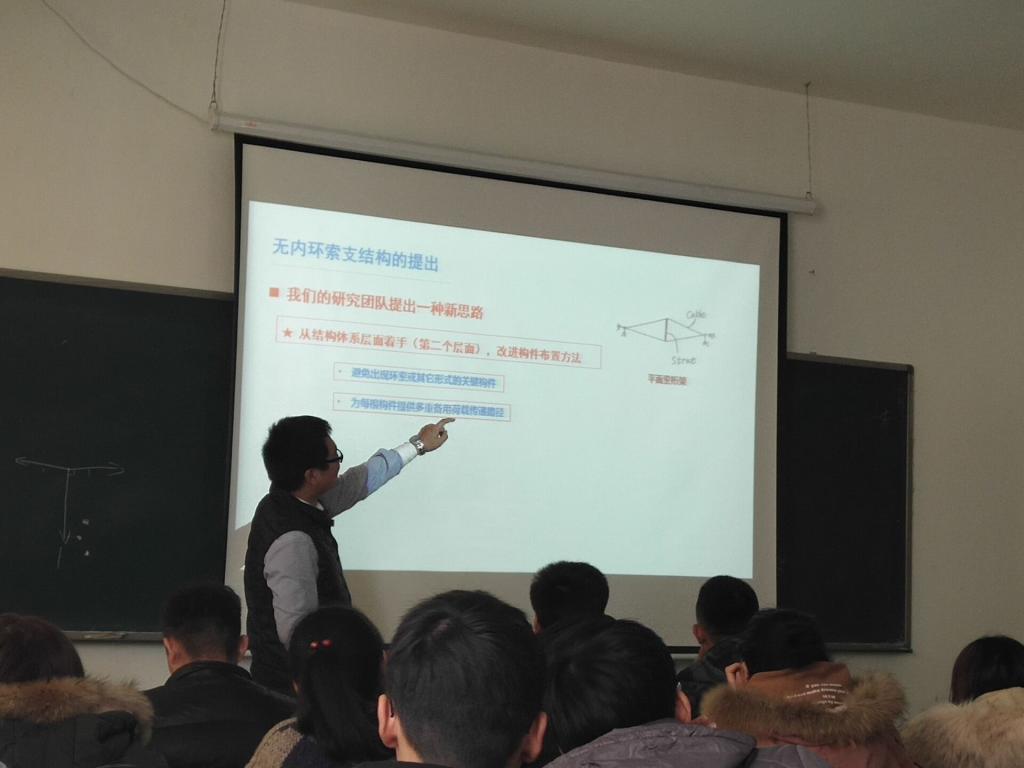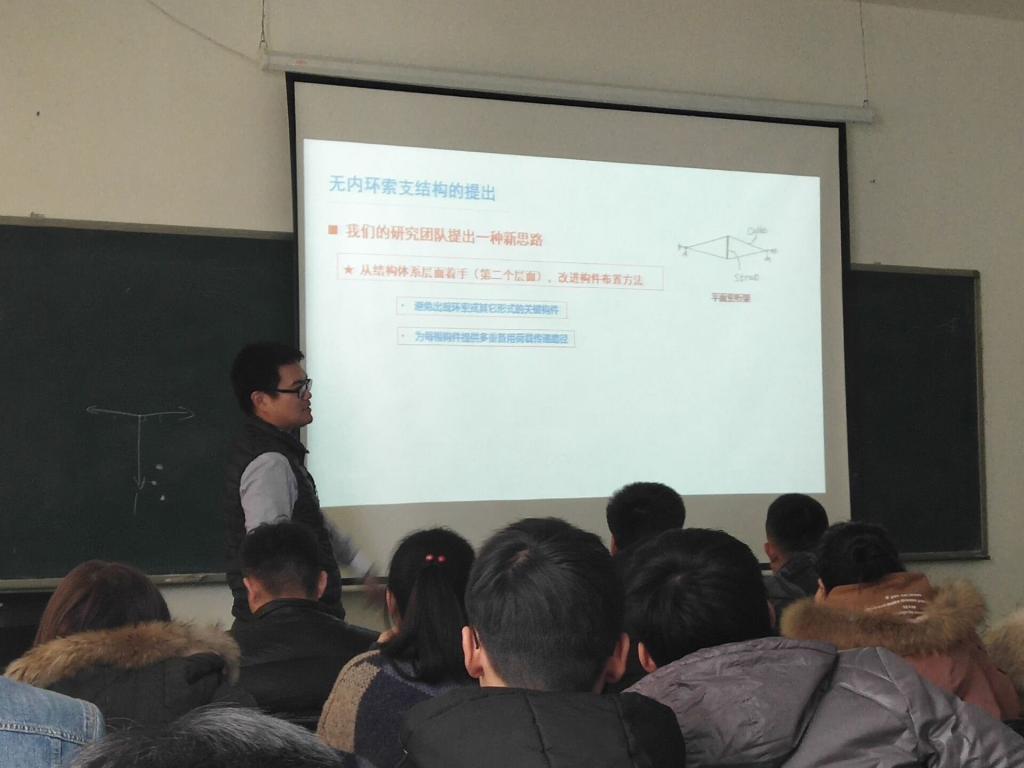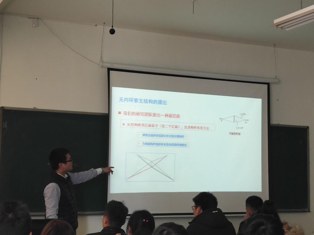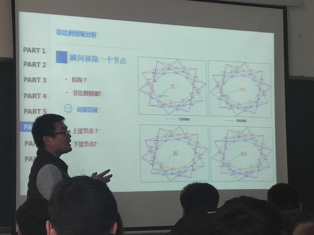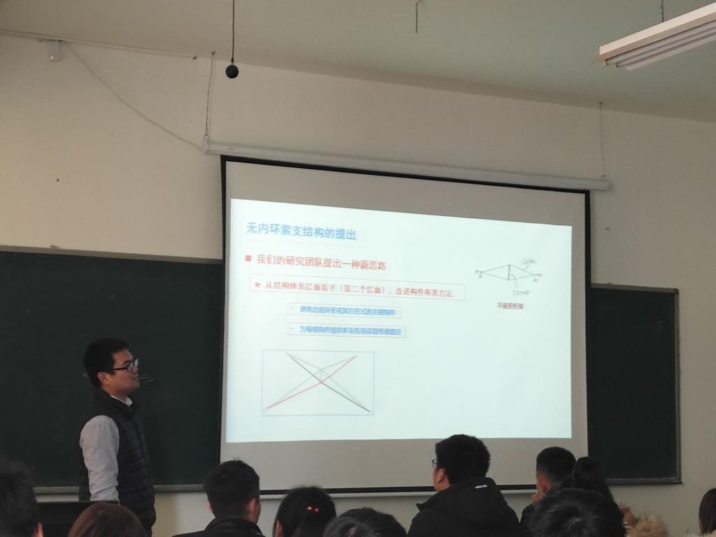 土木工程创新实践协会于2018年12月27日中午12:20在土木馆A311进行了刘人杰老师的讲座报告,其主题为“无内环索支结构体系---理论分析与试验研究”。“无内环索支结构”体系为刘老师本科时开始研究的比赛作品,对于它,刘老师以PPT的形式作了详细的介绍。报告中涉及①结构的提出②结构的几何形态③结构找形分析④节点设计⑤施工方法五大部分。对于这五大部分,协会成员具有比较浓厚的兴趣,刘老师也热情地向大家讲述。另外,刘老师在报告中还详细讲述了预应力与空间结构,有内环索支结构,无内环索支结构三大结构的特点。其一,预应力与空间结构,0.1个气膜结构就能撑起压强,其存在的优点是定工期很短,同时,刘老师又介绍了它的冗余度低和依赖预应力等缺点,呈现了它在某些方面的局限性。其二,有内环索支结构。刘老师主要讲述了内环索预应力及提出了作为关键构件的内环索由于内力巨大造成的自重大,用料多,结点设计困难等的缺点。最后,报告中展现了无内环索支结构,介绍了结构单元,平面索桁架特点,编程及参数化建模等。以上介绍是刘老师报告的大概内容。此次讲座报告后,刘老师耐心的向成员讲解不懂的地方,与协会成员进行互动与交谈。