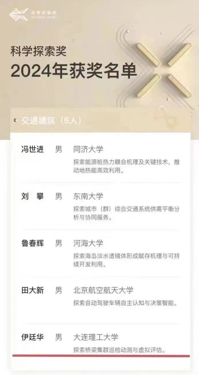近日,2024年“科学探索奖”获奖名单揭晓,共49位青年科学家获奖,其中,烟台大学土木工程学院1998级校友、大连理工大学伊廷华教授获此殊荣。