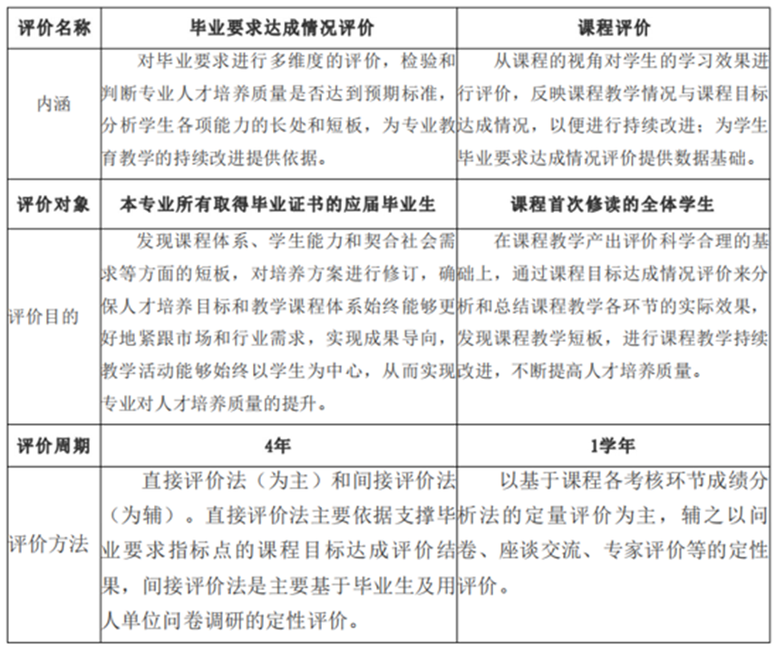 毕业要求达成情况评价与课程评价的目的、对象、方法均不同,课程评价是毕业要求达成情况评价的基础,两者的具体关系见下表: