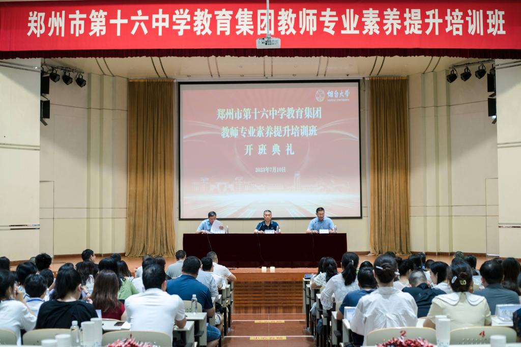 7月10日—13日,郑州市第十六中学教育集团教师专业素养提升培训班在烟台大学开班,郑州市第十六中学教育集团党委书记、校长朱红军、烟台大学继续教育学院副院长焦艳辉出席开班仪式。郑州市第十六中学教育集团共160余人参加培训,开班仪式由继续教育学院培训中心主任尤敬法主持。