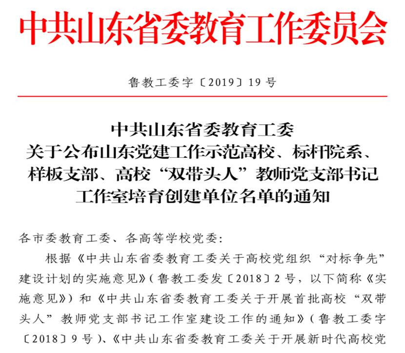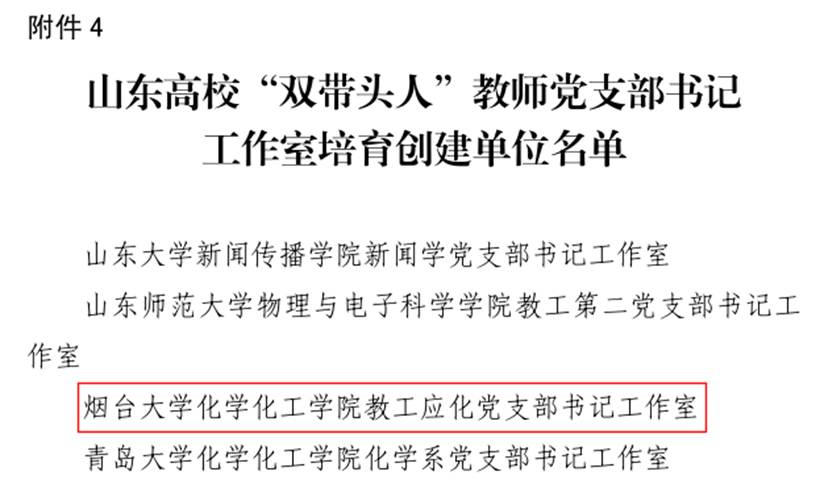 2019年学院教工应化党支部获评山东高校‘双带头人’教 师党支部书记工作室培育创建单位。