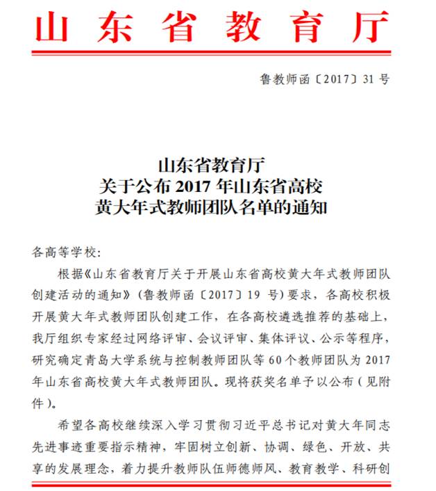 化学化工学院教师团队荣获“山东省高校黄大年式教学团队”