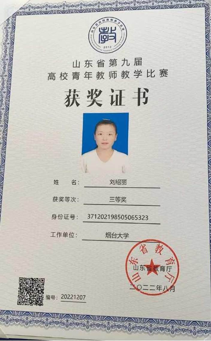 刘绍丽老师获山东省第九届高校青年教师教学比赛三等奖。