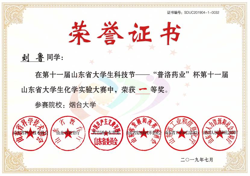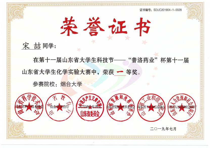 第十一届山东省大学生科技节——“普洛药业”杯第十一届山东省大学生化学实验大赛一等奖